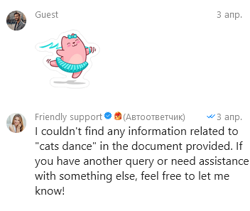 ИИ понимает контекст, но информации о танцующих котиках нет в FAQ, а значит ответ будет посредственным.